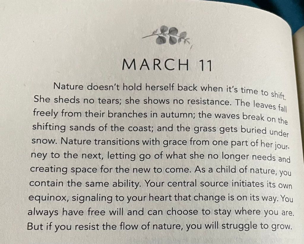 «La naturaleza no se detiene cuando llega el momento de cambiar. Ella no derrama lagrimas; ella no muestra resistencia. Las hojas caen libremente de las ramas en otoño; las olas rompen en las arenas cambiantes de la costa; y el zacate queda enterrado bajo la nieve. La naturaleza transiciona con gracia de una parte de su viaje a la siguiente, dejando ir lo que no necesita y creando espacio por lo nuevo que está por venir. Tu fuente central inicia su propio equinoccio, señalándole a tu corazón que el cambio está en camino. Siempre tienes libre albedrío y puedes elegir quedarte donde estás. Pero si te resistes el flujo the la naturaleza, tendrás dificultades para crecer.»